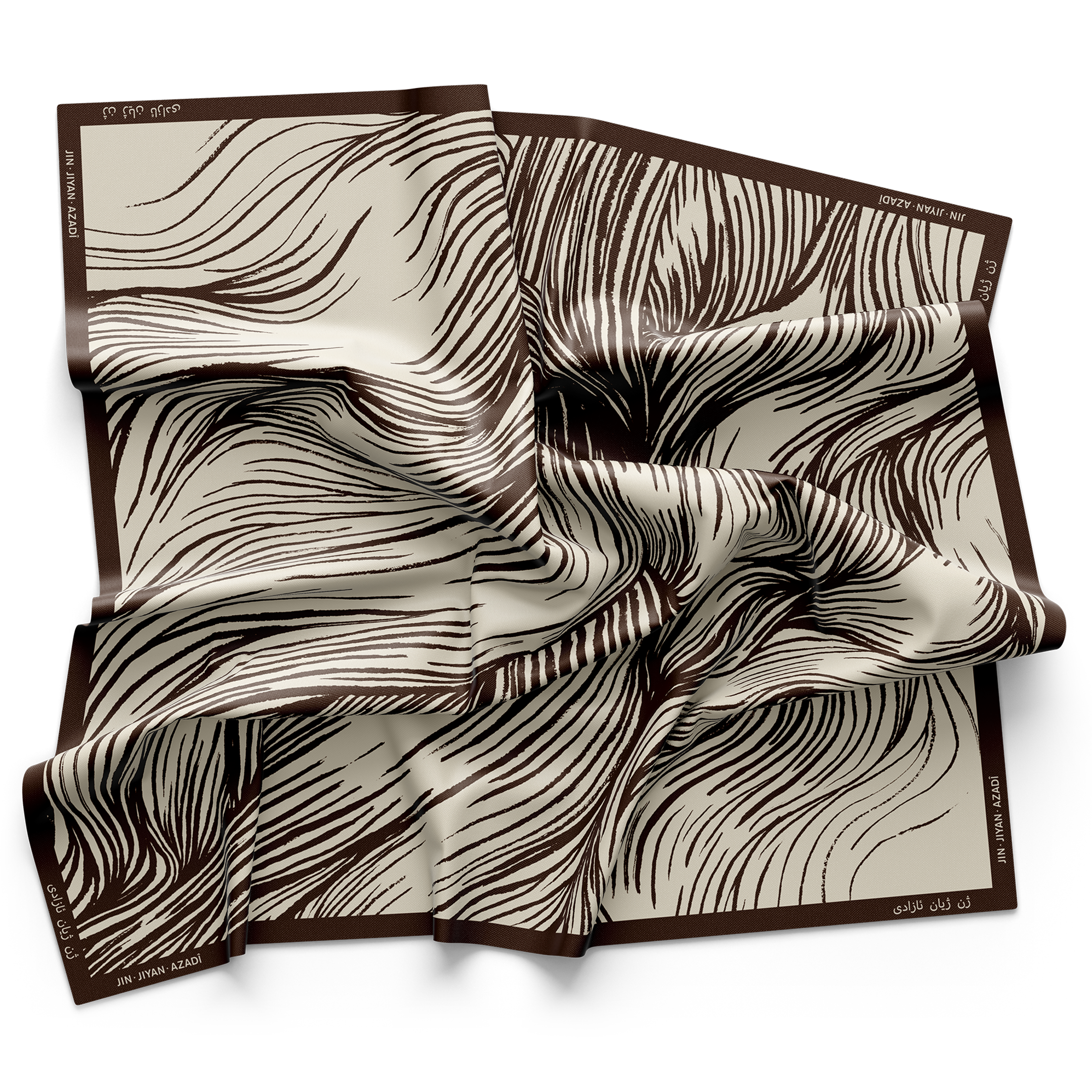 The scarf illustrates free-flowing hair with a frame around it. The corners are subtly decorated with the words Jin Jiyan Azadî (Woman Life Freedom). The illustration is hand drawn using watercolor and turned into a digital print.